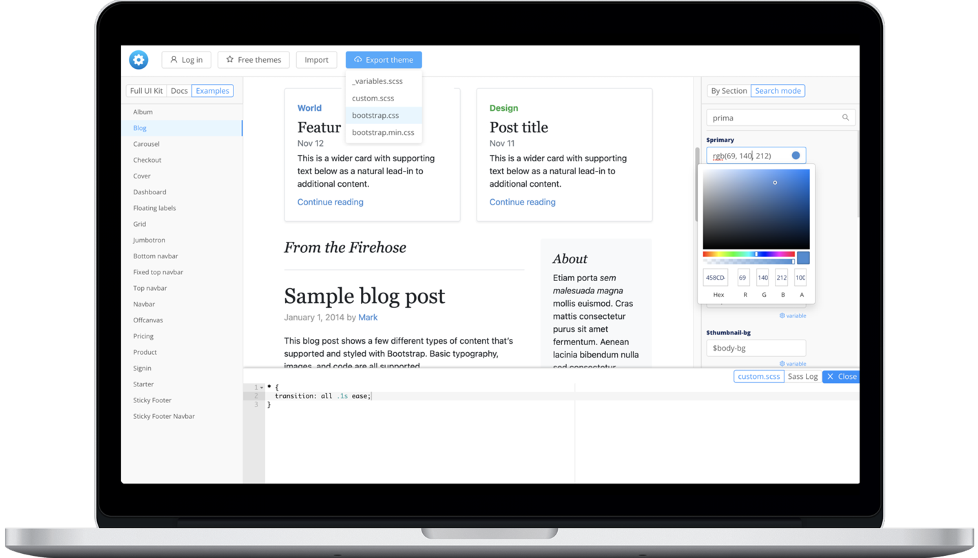 It has always been challanging to create a Bootstrap theme with a proper structure suggested in the official Bootstrap documentation. Bootstrap.build was created with a single goal to simplify that process. It provides a visual easy-to-use builder for Bootstrap themes. Preview your newly created theme on a variety of templates provided inside the builder and export it as a SASS/CSS bundle for production use.